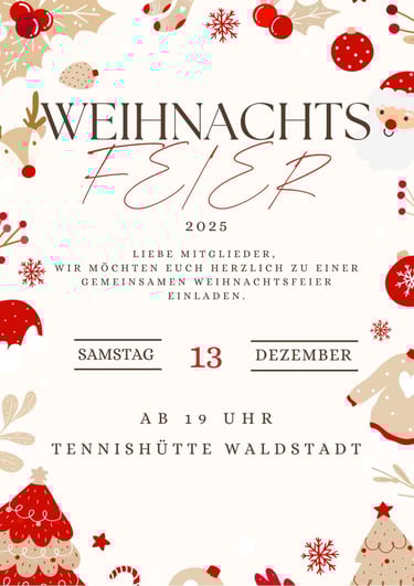Der TC Waldstadt lädt alle Mitglieder, Familien und Freunde herzlich zur diesjährigen Weihnachtsfeier ein! Freut euch auf einen gemütlichen Abend in vorweihnachtlicher Atmosphäre, mit netten Gesprächen, guter Stimmung und Zeit zum gemeinsamen Beisammensein. Für Musik und das leibliche Wohl ist selbstverständlich gesorgt.